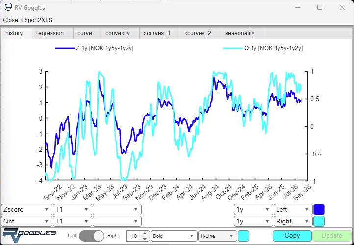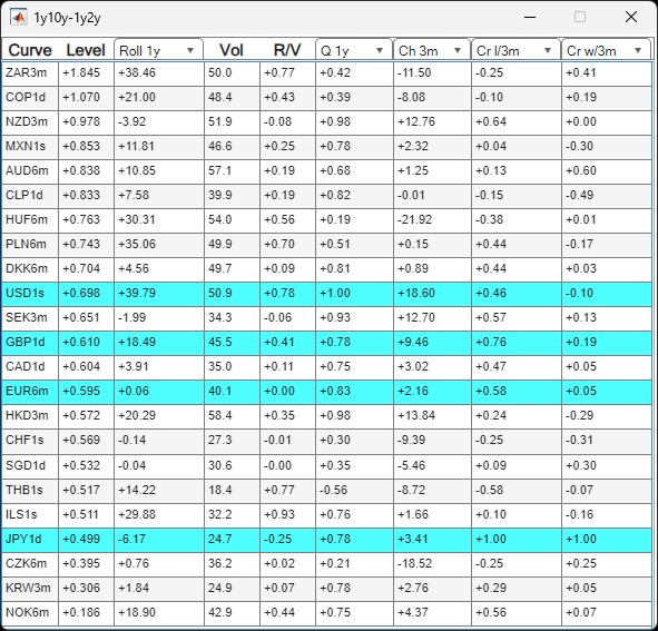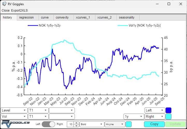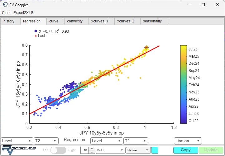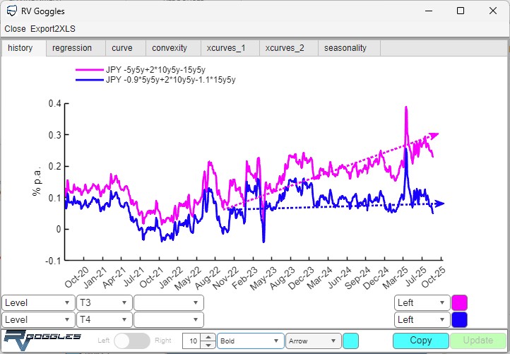 The user can define any linear RV trade combining forward interest rates on one or more swap curves. RV Goggles