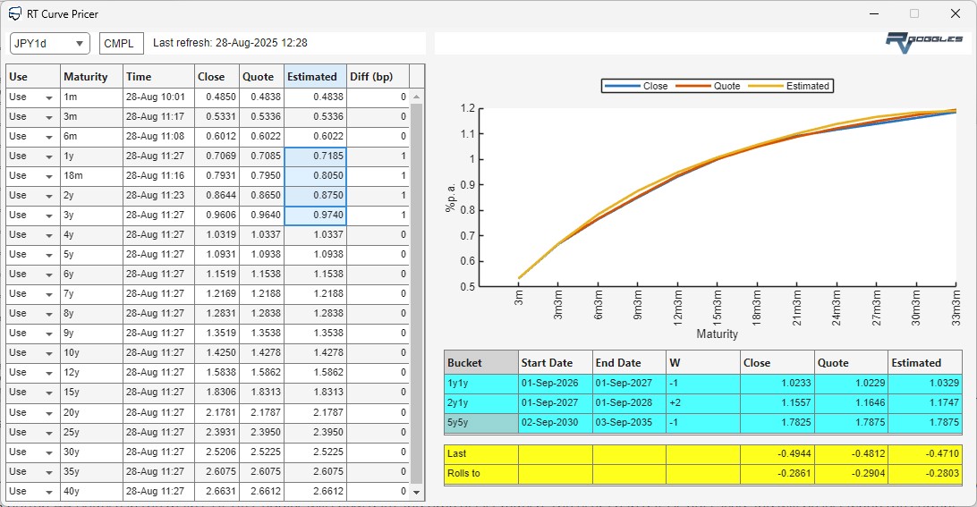 The user can define any linear RV trade combining forward interest rates on one or more swap curves. RV Goggles